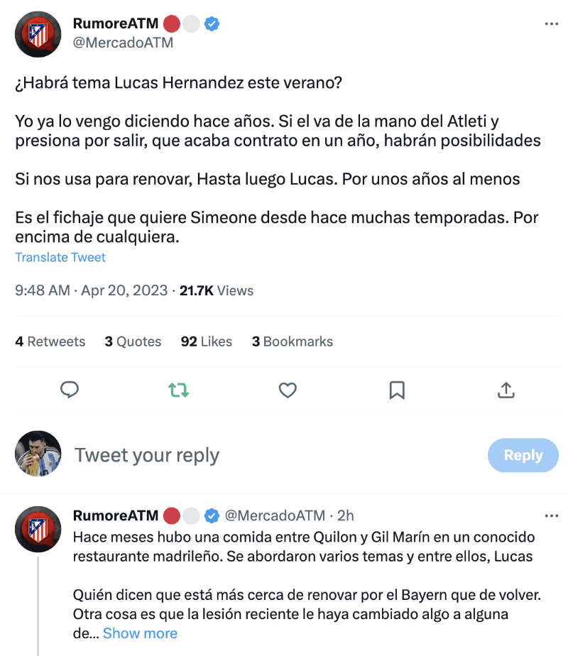 El contrato de Lucas Hernández es hasta el 2024, sin embargo por las lesiones constantes, Bayern Múnich consideraría prestarlo o dejarlo ir para que busque nuevos horizontes, ahí es donde entra el Atlético de Madrid, que podría ofrecerle un buen contrato y la posibilidad de jugar para que recupere su nivel, ya que Simeone no dudaría en contar con él.