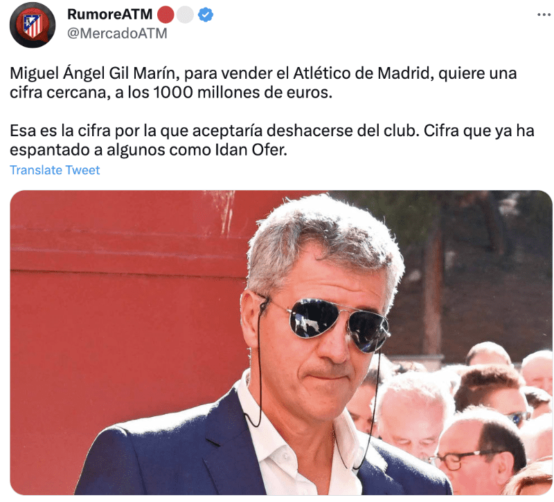 Por otro lado, de acuerdo a RumoreATM, “Miguel Ángel Gil Marín, para vender el Atlético de Madrid, quiere una cifra cercana, a los 1000 millones de euros. Esa es la cifra por la que aceptaría deshacerse del club. Cifra que ya ha espantado a algunos como Idan Ofer”. Solamente por esa cifra venderían al club.