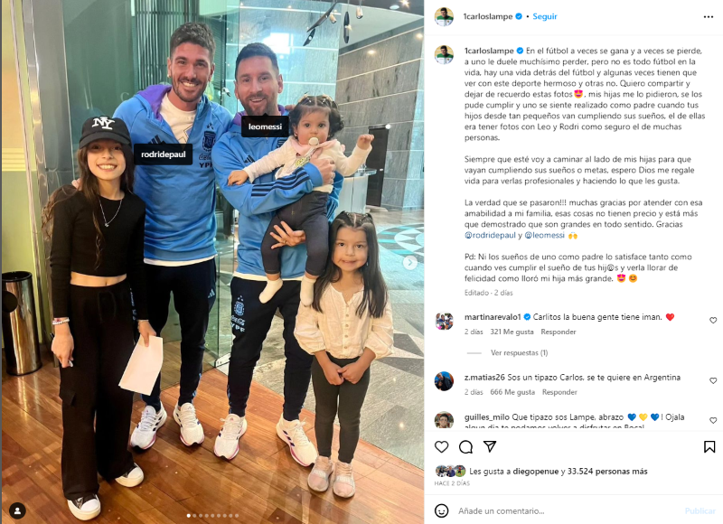 El referente y guardameta de la selección boliviana Carlos Lampe hablo de un momento personal que Rodrigo de Paul y Lionel Messi tuvieron con sus hijas, el cual reflejo hace pocas horas en sus redes sociales con un gran agradecimiento y la humildad que le caracteriza citando al astro argentino y al referente colchonero en el post: 'La verdad que se pasaron!!! Muchas gracias por atender con esa amabilidad a mi familia, esas cosas no tienen precio y está más que demostrado que son grandes en todo sentido. ¡¡¡Gracias Rodri De Paul y Leo Messi!, ¡La verdad que se pasaron!!! Muchas gracias por atender con esa amabilidad a mi familia, esas cosas no tienen precio y está más que demostrado que son grandes en todo sentido', citó el guardameta.