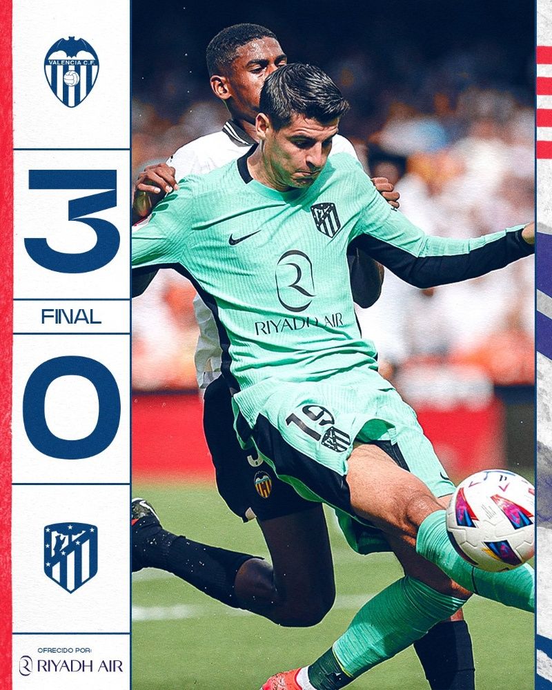 Finalmente, Valencia se impuso tres por cero frente al Atlético de Madrid, que queda con varias preocupaciones, pues tuvo un pésimo desempeño en el compromiso previo al debut por Champions y al próximo derbi, y además, tiene un nuevo lesionado que aparentemente puede ser por un tiempo prolongado.
