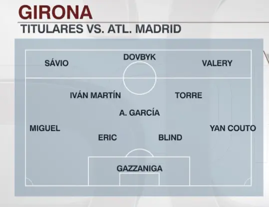 Nahuel Molina sigue sin figurar en la titular, pues está en el peor de sus momentos y se ha convertido en un peligro para el Atlético de Madrid. Contra todo pronóstico, el que jugará como carrilero derecho será Rodrigo Riquelme. Es la primera vez que el Roro jugará aquí, mientras Samuel Lino hace lo propio por la izquierda. Sin más, así formarán Girona y Atlético de Madrid.