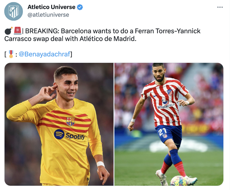 FC Barcelona ha decidido ir por todo con Carrasco del Atlético de Madrid. El volante de nacionalidad belga puede dar el cambio de camiseta porque Joan Laporta está decidido a contratarlo y por ello, de acuerdo a información de Atletico Universe, ponen como moneda de cambio a Ferrán Torres, del cuadro Culé.